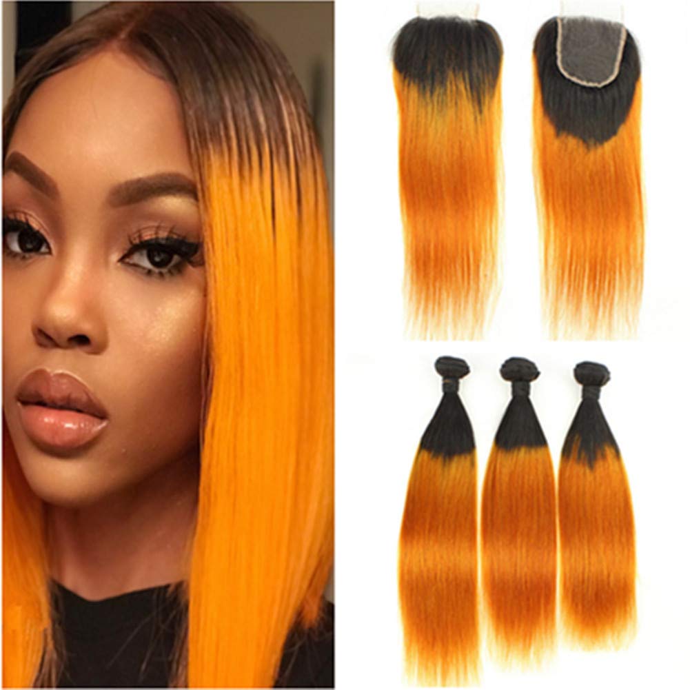 Amazon Com 1b Orange Ombre Human Hair 3 Bundles And Closure Brazilian Straight Black And Burnt Orange Ombre Weaves Human Hair Bundles With Lace Closure 4x4 Dark Roots Hair Extensions 10 12